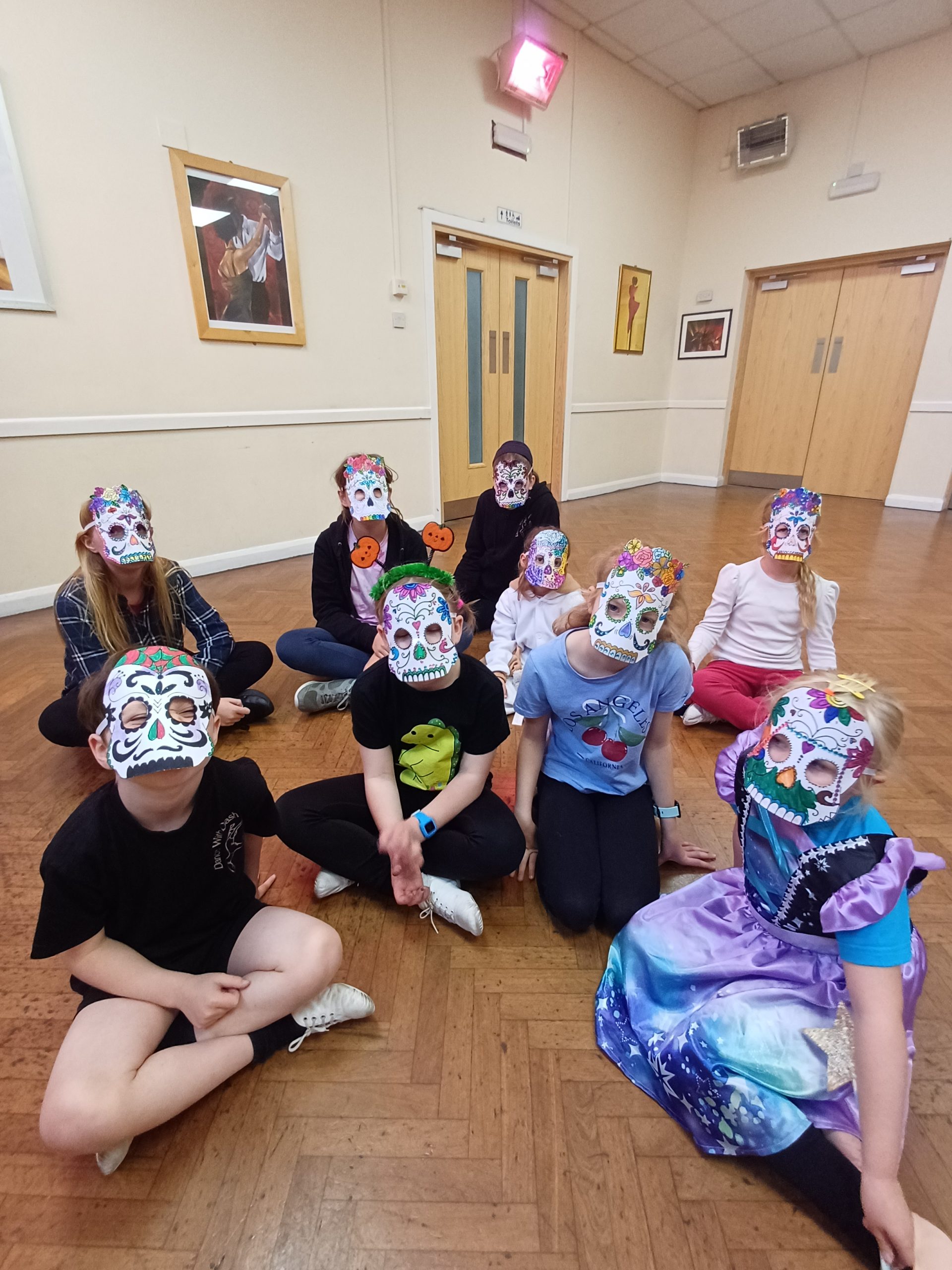 We began by creating a day of the dead inspired dance, breaking up into smaller groups to choreograph, using the ideas of different levels when travelling and freezing in a spikey shape. Some really beautiful masks were made to use for this dance.